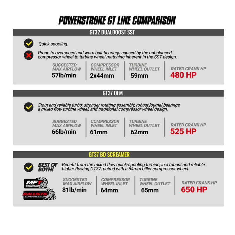 The drop-in, stock-appearing Screamer turbo for the later model Ford 6.7L Powerstroke utilizes modern turbo technology that delivers increased airflow without compromising on low end response. Boost pressure can be increased to improve horsepower potential. The Powerstroke Screamer turbo works with any 'box' tuner and further improvements achieved with custom tuning. Drop-in turbo reuses the factory 2017-2019 turbo pedestal.