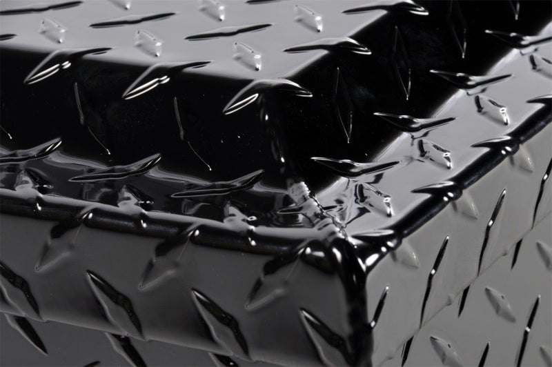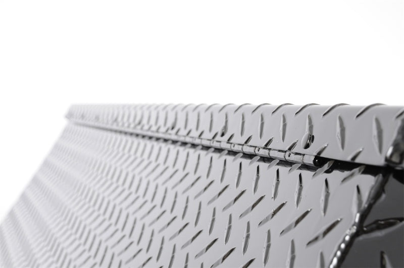 Dee Zee Tool Box - Blue Label (Contractor Grade) Side Mount. Constructed of heavy gauge Brite-Tread aluminum. Black-Tread powder coat, provides a gloss black finish while it protects and prevents oxidation. Large push button with self-adjusting latches. Hidden hinge, gas shocks, Alumaguard strengthening channel, and adjustable strikers on a hat style lid. Works great by self or maximize your storage options with a matching crossover.