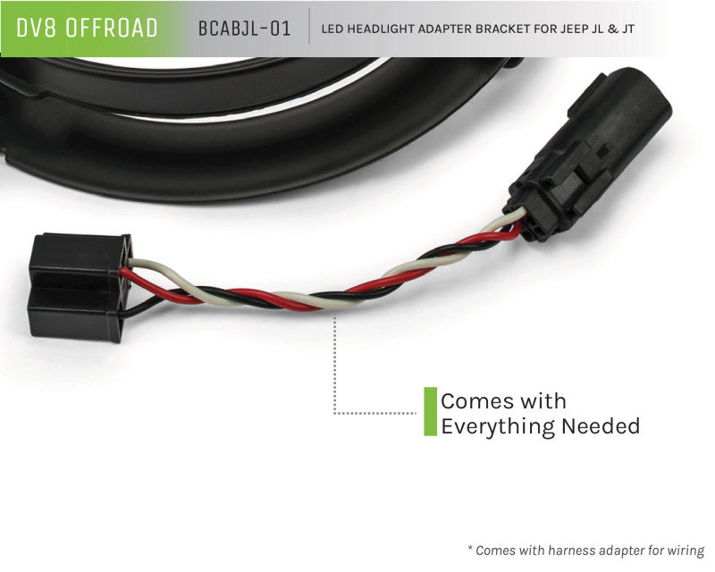 The DV8 Offroad BCABJL-01 is an adapter kit to fit 7 Inch JK or TJ headlights onto a Jeep JL and Gladiator. Let's face it, there are a lot of really cool and inexpensive 7 Inch headlights for older generation Jeeps but not so many 9 Inch lights to fit the JL and Gladiator. With this kit you have everything you need to mount aftermarket headlights into your Jeep! Details: Plug and play, Comes with harness adapters for wiring, Will work with any 7 Inch JK or TJ headlight, Adjustable like OEM, Sold As: Kit.