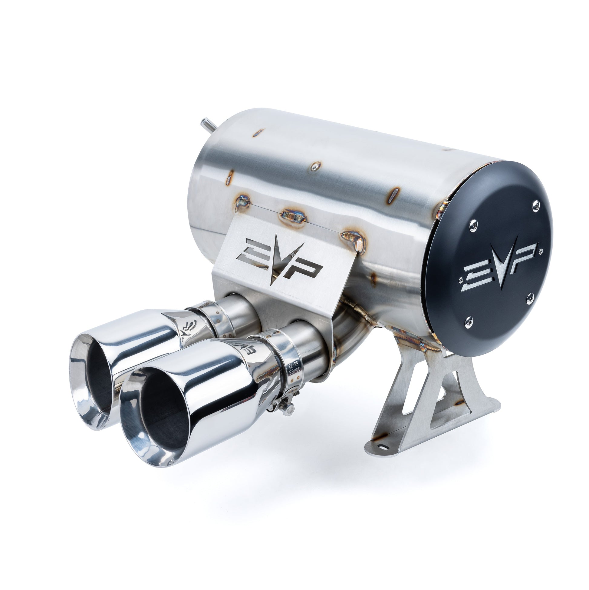 The muffler’s twin exit design can be finished off in three different tip options: Blue Flame Dual Wall Stainless Steel, Rolled Edge Stainless Steel, or Dual-Wall Stainless Steel. Additional styling features include a black powder-coated muffler end cap with laser-etched EVP logo set off by a riveted raw aluminum backing plate.
