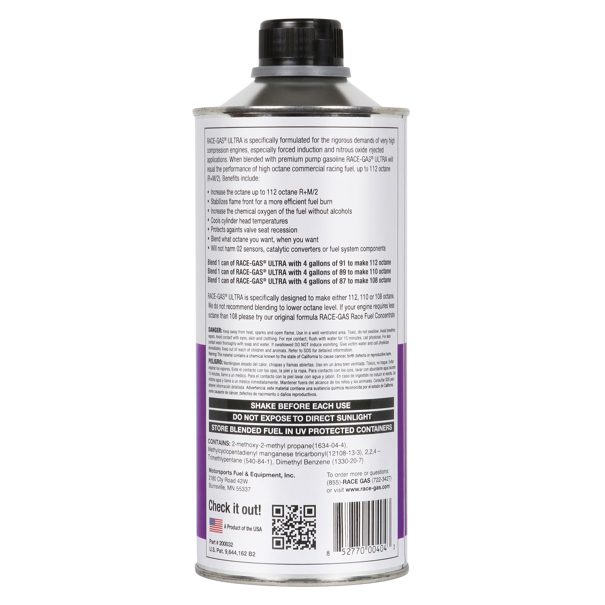 The Race Gas Ultra Fuel Concentrate – Octane Booster 32oz. transforms premium pump gas into high-octane race fuel. Designed for high-performance engines, this concentrate boosts octane, improves combustion efficiency, and protects against detonation during aggressive driving or racing.